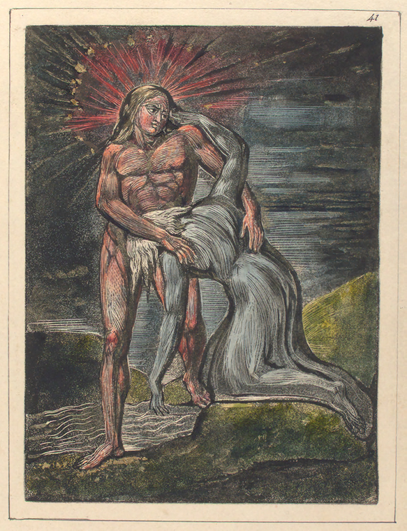 Milton, Plate 40 [46], (E 141) "Before Ololon Milton stood & percievd the Eternal Form Of that mild Vision; wondrous were their acts by me unknown Except remotely; and I heard Ololon say to Milton I see thee strive upon the Brooks of Arnon. there a dread And awful Man I see, oercoverd with the mantle of years. I behold Los & Urizen. I behold Orc & Tharmas; The Four Zoa's of Albion & thy Spirit with them striving In Self annihilation giving thy life to thy enemies"